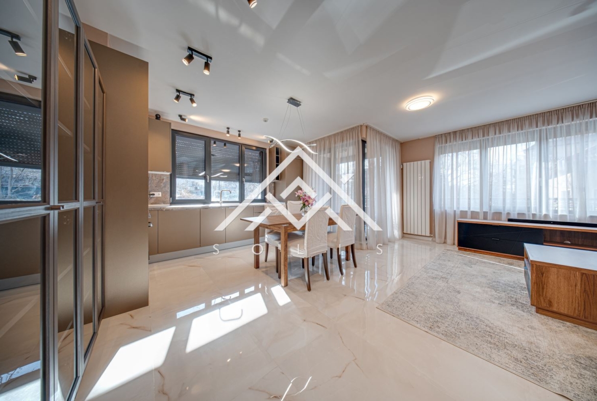 Разположен е на първи етаж и разполага със застроена площ около 110 кв.м, тераси около 33 кв.м и собствен двор с градина около 45 кв.м. Дневната е организирана като общо пространство с кухня и трапезария и има излаз към голяма ъглова тераса. Коридорът води към двете спални. Основната спалня е със собствена баня и директен изход към двора, налична е втора баня и отделно сервизно помещение за пералня и сушилня.